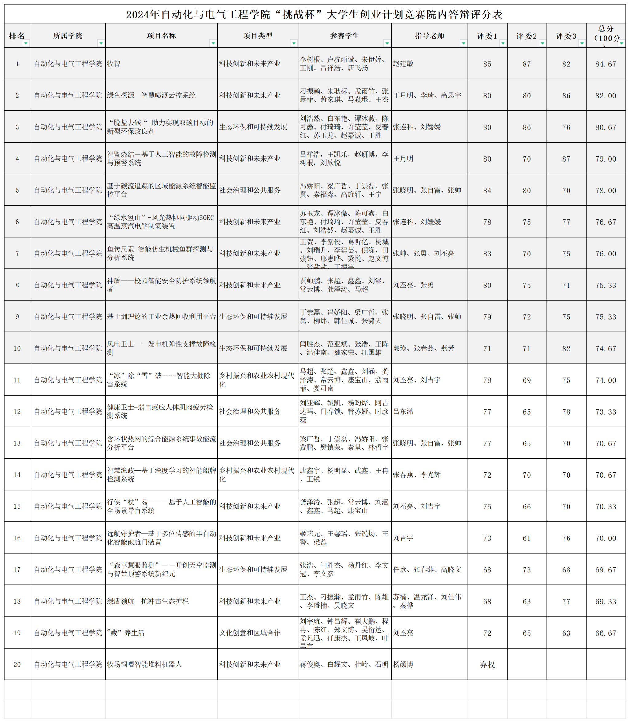 根据学校《关于开展第十四届“挑战杯”中国大学生创业计划竞赛校内选拔工作的通知》要求,通过自主申报、学院评审环节,现将学院“挑战杯”大学生创业计划竞赛院内成绩公示如下,根据学校要求推送学院报名项目数的50%进行校内评选,具体材料收集事宜后期通知: