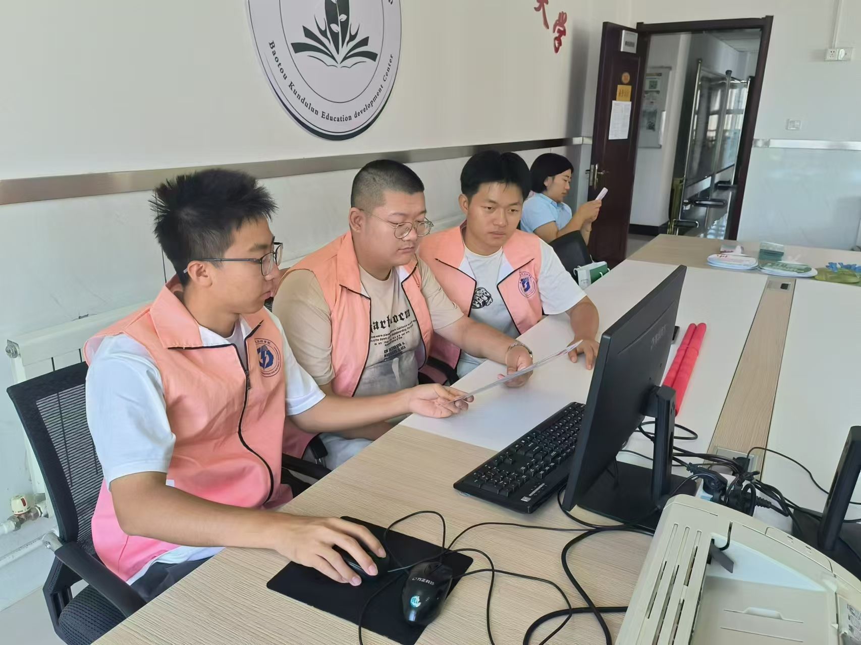 在杨文君老师的带领下,社会实践小组前往包头市昆都仑区教育事业发展中心,参与资助政策的落实、帮助学生家庭了解最新资助政策、审核贷款申请、协助社会助学项目的管理与发放等资助工作。为了更好的帮助学生及家长,小组成员配合指导老师学习最新在线工作系统的使用,协助家长及同学完成助学贷款网络前期注册,帮助工作人员完成网上信息的录入工作。