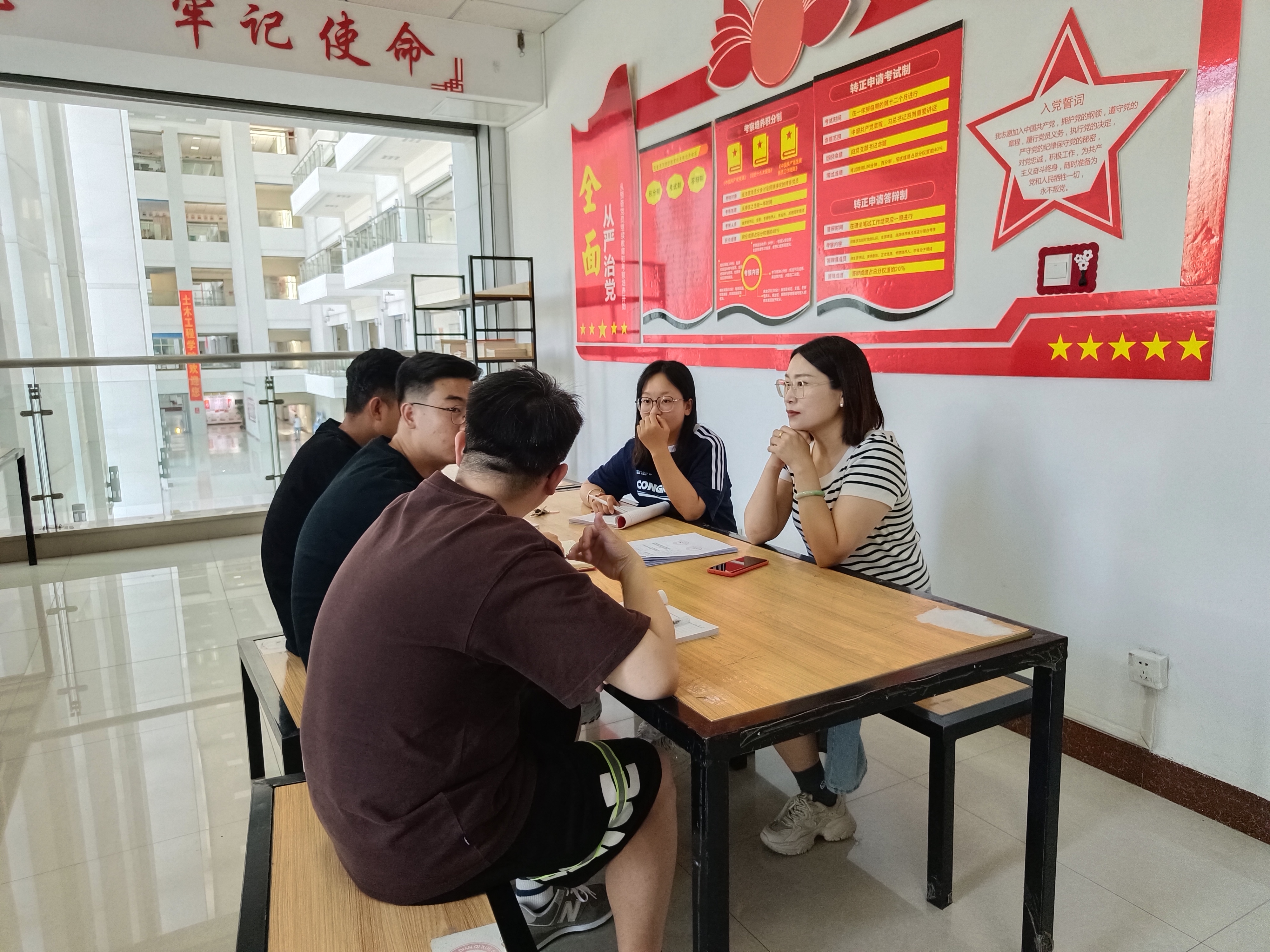 为贯彻落实支委会的决策,不断优化支部工作机制,加强党员队伍建设,积极开展各项活动。太阳集团tyc138学生第二党支部于2024年5月27日在逸夫楼支部示范区召开了支委会。支部书记郭聪如老师同组织委员贾晓宇同志、纪检委员李守智同志、宣传委员宋义旸同志、青年委员于向丽同志就8位发展对象的预审情况、支部书记讲党课、换届大会、转正大会程序的相关事宜进行了探讨。