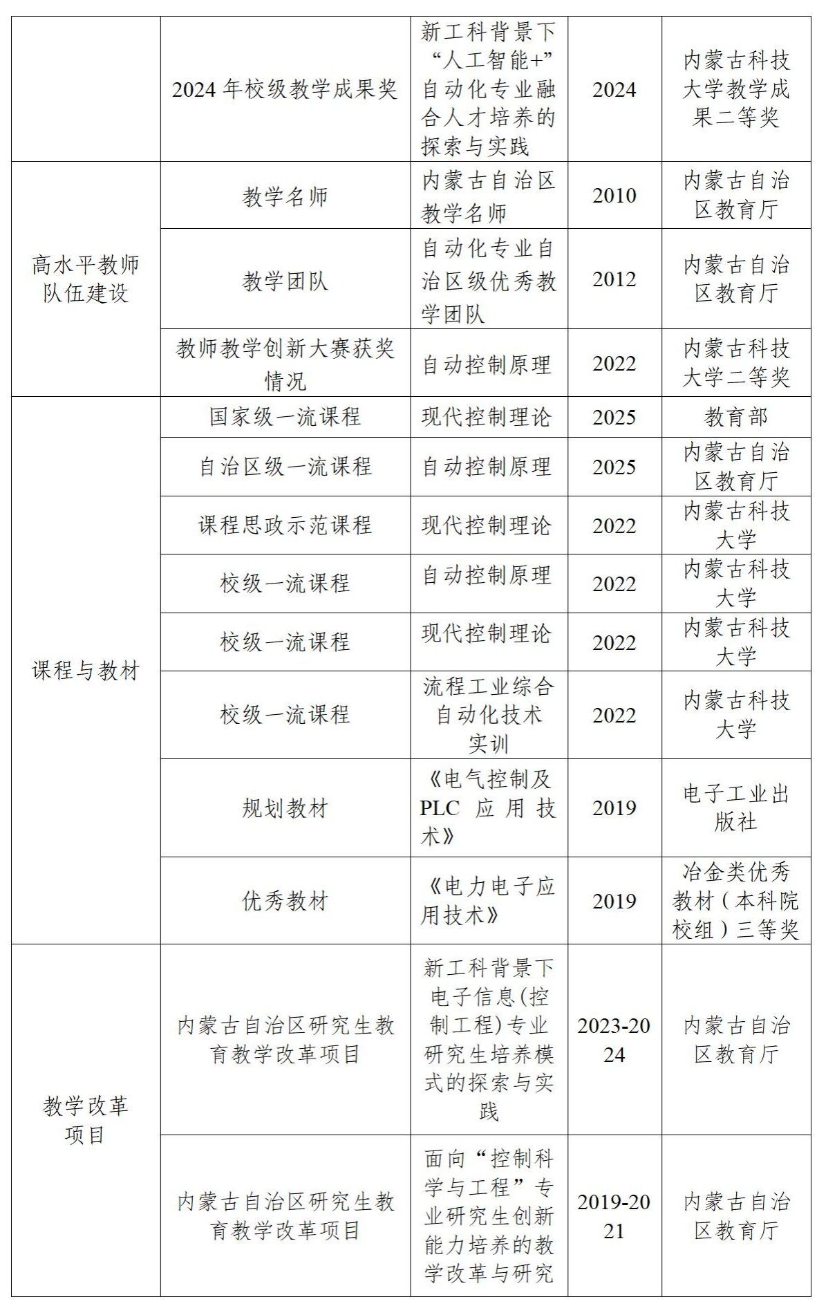 2024年获中国自动化学会高等教育教学成果(研究生)三等奖1项;